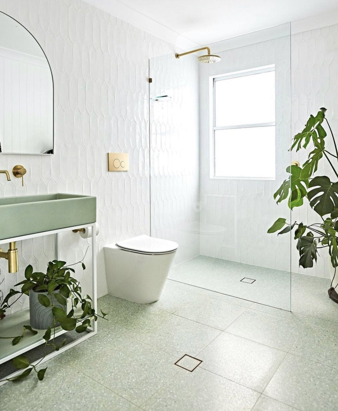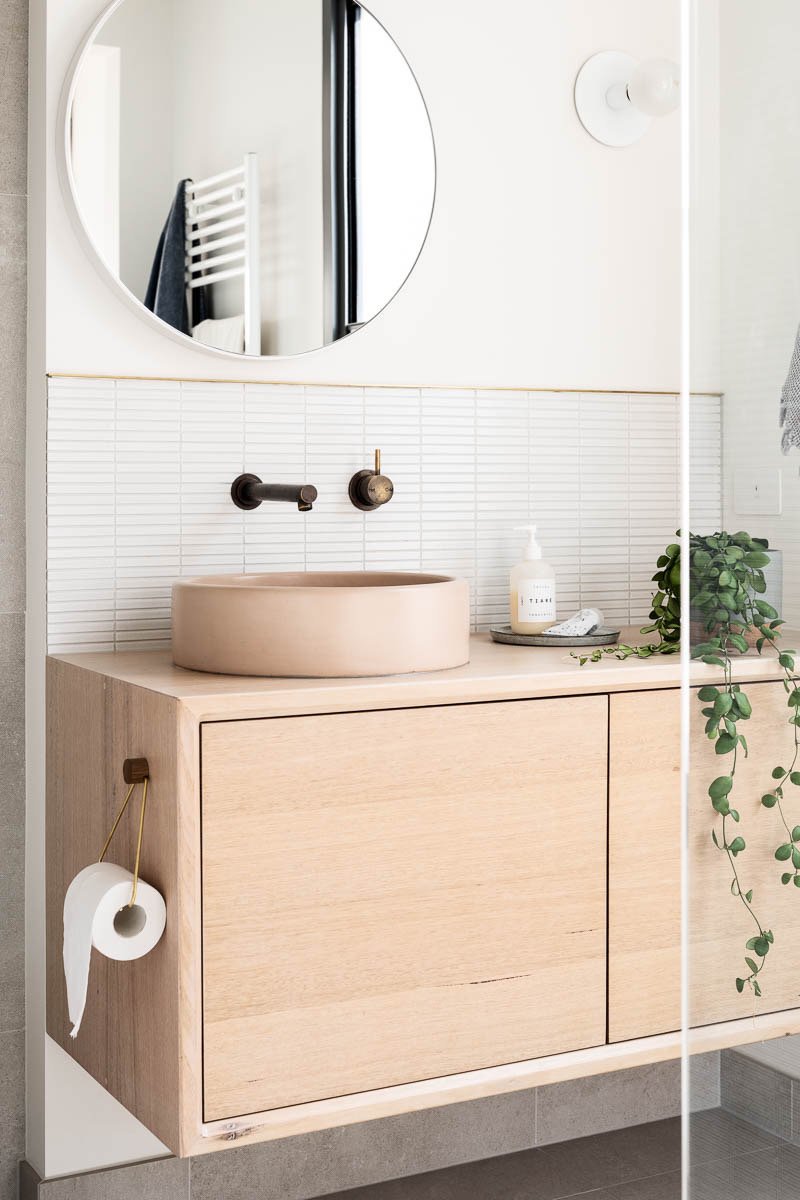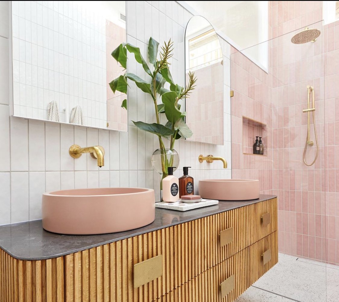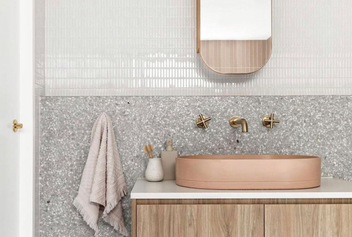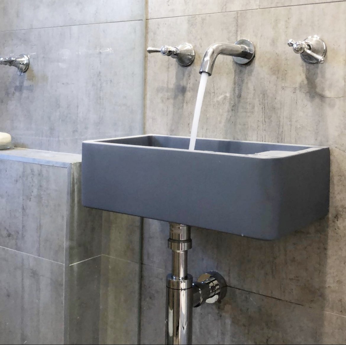 "We designed and handmade the Trough Sink Vanity Set, a chevron- patterned parquetry concrete tile. The results were magical. The process forced us to look at the problems of concrete. The strength, colour, durability, sealer, packaging and much more. Needless to say, concrete had problems".
